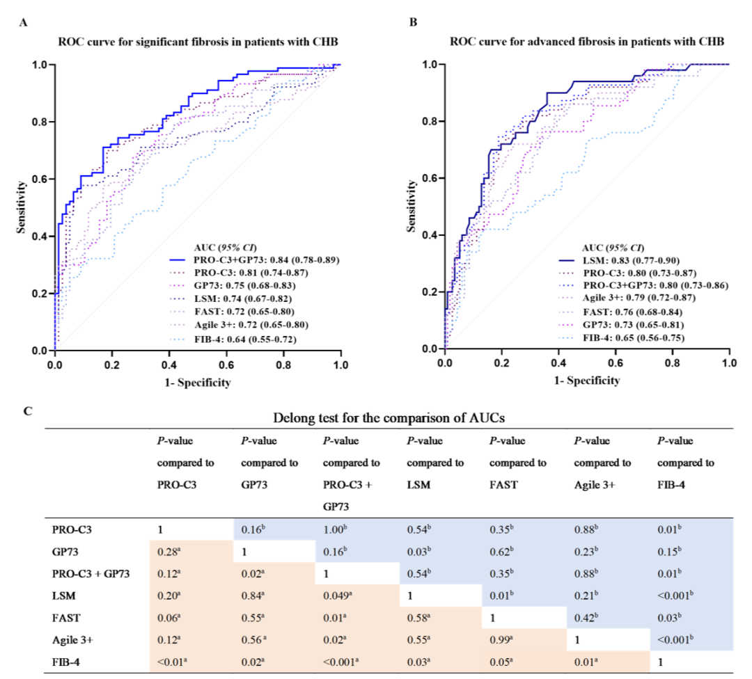 PRO-C3,尤其是與GP73聯(lián)合使用,是一種可用于識(shí)別CHB患者的肝纖維化的可靠的非侵入性檢測(cè)指標(biāo),其診斷準(zhǔn)確性優(yōu)于FIB-4、FAST、Agile 3+和LSM。這為監(jiān)測(cè)CHB患者的纖維化進(jìn)程和指導(dǎo)臨床決策提供了新的、具有成本效益的準(zhǔn)確選擇。