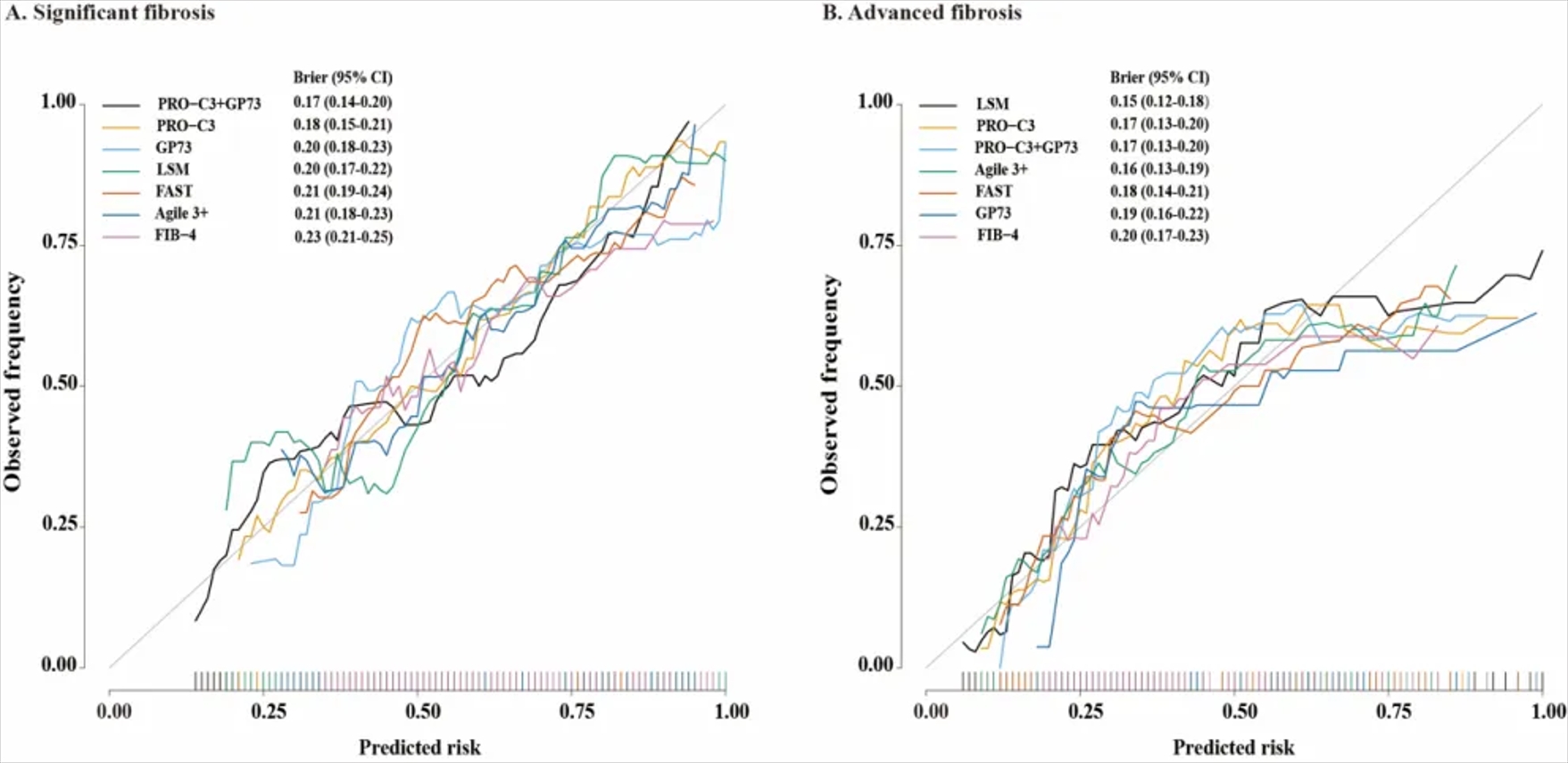 校準(zhǔn)曲線也顯示,在診斷顯著纖維化方面,PRO-C3聯(lián)合GP73的Brier評(píng)分最低(0.17),其次是PRO-C3、LSM、GP73、FAST、Agile 3+、FIB-4(圖2A)。在診斷進(jìn)展期纖維化方面,PRO-C3和PRO-C3聯(lián)合GP73模型的Brier評(píng)分均為0.17,其診斷效能優(yōu)于FIB-4(0.20)和FAST(0.18)(圖2B)。