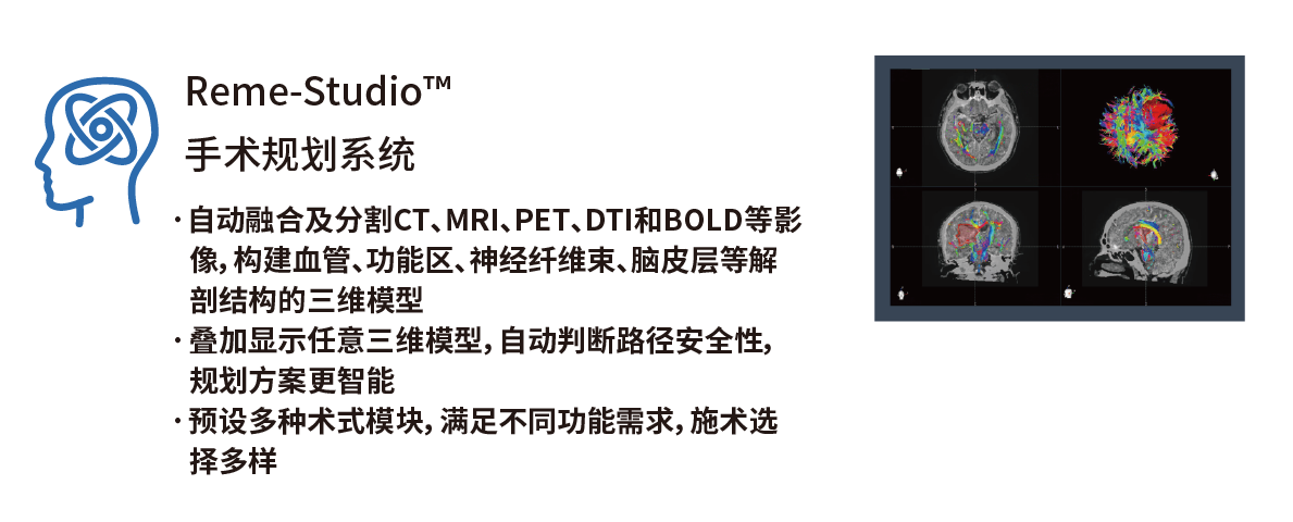 Q:睿米?手術(shù)規(guī)劃軟件包含什么功能?A:手術(shù)規(guī)劃軟件可實(shí)現(xiàn)包含CT、MRI、PET、DTI等多模態(tài)影像融合,多種組織分割以及高級(jí)影像處理功能,滿足神經(jīng)外科手術(shù)影像處理及手術(shù)規(guī)劃多種需求。