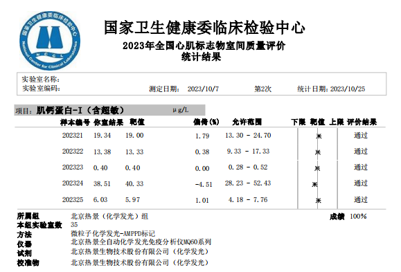 近日,國家衛(wèi)生健康委臨床檢驗(yàn)中心(NCCL)公布了2023年第二次全國臨床檢驗(yàn)室間質(zhì)量評(píng)價(jià)結(jié)果。經(jīng)了解,熱景生物心肌標(biāo)志物(肌酸激酶同工酶、肌紅蛋白、肌鈣蛋白I)、血清降鈣素原項(xiàng)目的上轉(zhuǎn)發(fā)光及化學(xué)發(fā)光兩大平臺(tái)產(chǎn)品,以及D-二聚體、白介素6、胃蛋白酶原項(xiàng)目的化學(xué)發(fā)光平臺(tái)產(chǎn)品均滿分通過此次室間質(zhì)量評(píng)價(jià)。同時(shí),熱景生物參與的上海臨床檢驗(yàn)中心2023年第二次能力驗(yàn)證活動(dòng),包括AFP異質(zhì)體比率、B型鈉尿肽/N末端B型鈉尿肽前體、心肌標(biāo)志物(肌酸激酶同工酶、肌紅蛋白、肌鈣蛋白I)、血清降鈣素原等項(xiàng)目在內(nèi)的產(chǎn)品均通過評(píng)價(jià)。