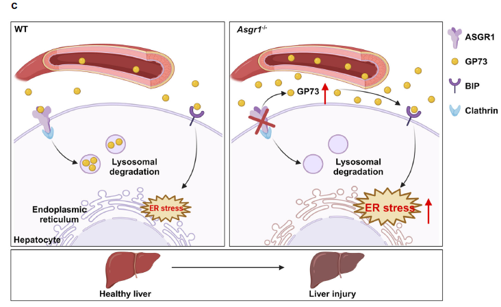 肝臟損傷是多數(shù)肝臟疾病的核心病理過程,然而其發(fā)生與進(jìn)展中的遺傳易感因素仍未充分揭示。本研究發(fā)現(xiàn),唾液酸糖蛋白受體1(ASGR1)在肝纖維化或肝硬化患者及遭受肝損傷的雄性小鼠中表達(dá)下調(diào)。ASGR1缺陷會(huì)加重乙酰氨基酚誘導(dǎo)的急性肝損傷和CCI4誘導(dǎo)的慢性肝損傷,而其過表達(dá)則能減輕這些損傷。機(jī)制上,ASGR1與內(nèi)質(zhì)網(wǎng)應(yīng)激介質(zhì)GP73結(jié)合,促進(jìn)其溶酶體降解。ASGR1耗竭導(dǎo)致循環(huán)中GP73水平升高,并促進(jìn)GP73與BIP相互作用,激活內(nèi)質(zhì)網(wǎng)應(yīng)激,進(jìn)而引發(fā)肝損傷。中和GP73不僅能緩解ASGR1缺陷引起的肝臟損傷,還能提高接受致死劑量乙酰氨基酚的小鼠存活率。研究結(jié)果表明 ASGR1 缺陷會(huì)加劇肝損傷,ASGR1-GP73 軸成為肝損傷的潛在治療靶點(diǎn)。
