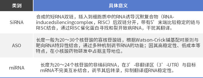 小核酸藥物狹義是指RNA小干擾藥物(small interfering RNAs,siRNA);廣義是除了SiRNA外,還主要包括反義寡核苷酸藥物(antisense oligonucleotides,ASOs)和靶向微小RNA(microRNA,miRNA)等。全球的藥物開發(fā)重點主要為siRNA和ASO。