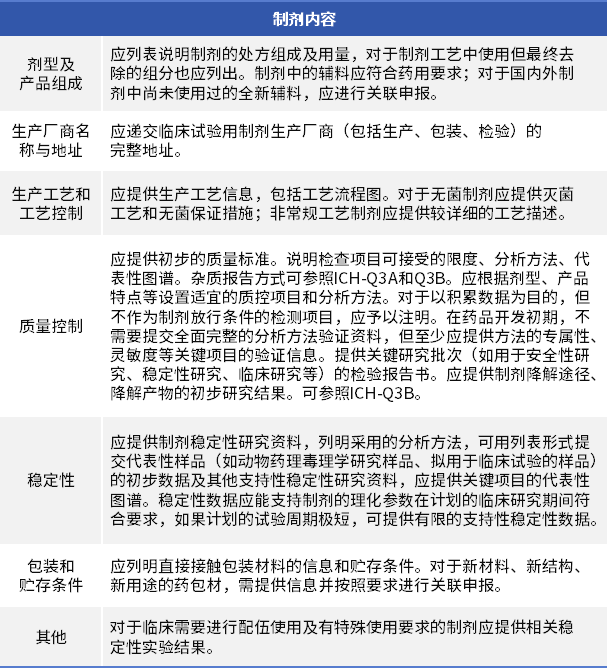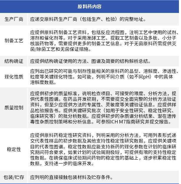 由于小核酸藥物的制備,通常使用固相合成技術,故工藝開發(fā)、工藝放大和質(zhì)量控制上存在一定的壁壘,對技術、設備、環(huán)境有較高的要求,伴隨著的也是高成本,國內(nèi)對于這方面的硬件條件配套,還有很大的發(fā)展空間。早期的注冊申報,如果按照《新藥I期臨床試驗申請技術指南》進行工作開展,原料藥和制劑需要按照以下內(nèi)容進行。