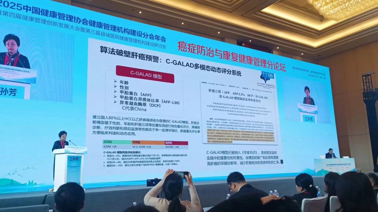 在《癌癥防治與康復(fù)健康管理》專項(xiàng)論壇中,復(fù)旦大學(xué)附屬中山醫(yī)院江孫芳主任受邀發(fā)表專題報(bào)告《健康管理中心-社區(qū)聯(lián)動(dòng) 助力肝癌早篩》,從臨床實(shí)踐與科研結(jié)合的角度,系統(tǒng)闡述了C-GALAD模型在肝癌早期篩查中的創(chuàng)新應(yīng)用價(jià)值。