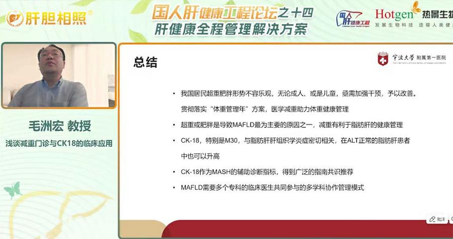 寧波大學(xué)附屬第一醫(yī)院內(nèi)分泌科毛洲宏教授在會(huì)議上圍繞“減重門(mén)診與CK18的臨床應(yīng)用”作專(zhuān)題報(bào)告,強(qiáng)調(diào)國(guó)家衛(wèi)健委“體重管理年”政策推動(dòng)下,醫(yī)療機(jī)構(gòu)需加強(qiáng)減重門(mén)診建設(shè),為超重及肥胖人群提供專(zhuān)業(yè)化服務(wù)。毛教授也以本院“肥胖俱樂(lè)部”在開(kāi)設(shè)近十年的真實(shí)經(jīng)驗(yàn),給我們科普了減重管理的重要性。目前,我國(guó)超重肥胖形勢(shì)嚴(yán)峻,超50%成人存在體重異常,肥胖與代謝相關(guān)脂肪性肝病(MAFLD)密切相關(guān),約20% MAFLD患者可能進(jìn)展為脂肪性肝炎(MASH),T2DM患者合并MAFLD比例高達(dá)65.04%。毛教授指出,傳統(tǒng)檢測(cè)手段如ALT、B超在早期診斷MASH及纖維化中存在局限性,而細(xì)胞角蛋白18(CK-18)片段作為新型生物標(biāo)志物,通過(guò)M30/M65片段可無(wú)創(chuàng)評(píng)估肝細(xì)胞凋亡與壞死,其敏感性與特異性顯著優(yōu)于傳統(tǒng)指標(biāo)。此外,MAFLD需多學(xué)科協(xié)作管理,結(jié)合減重、改善代謝、抗纖維化等綜合干預(yù)措施,定期監(jiān)測(cè)高危人群。毛教授總結(jié)稱(chēng),CK18的應(yīng)用將推動(dòng)MAFLD精準(zhǔn)診療,而政策支持與多學(xué)科模式普及,為肥胖及相關(guān)代謝疾病防控注入新動(dòng)力。