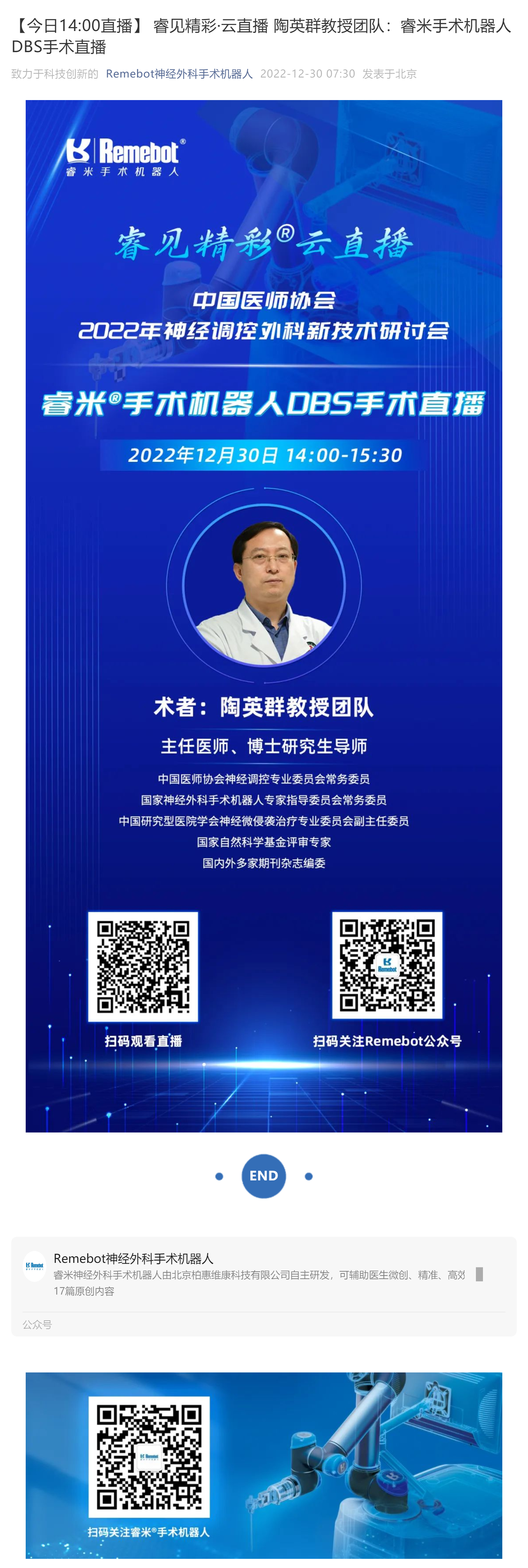 【今日14:00直播】 睿見精彩·云直播 陶英群教授團隊:睿米手術機器人DBS手術直播
