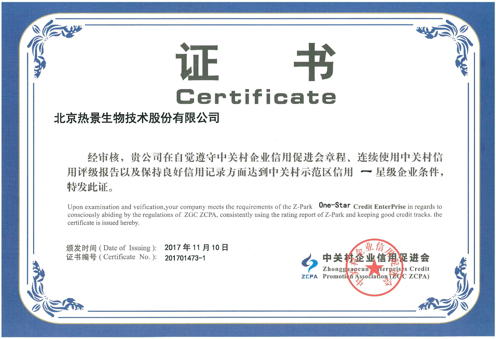 中關(guān)村信用促進(jìn)會(huì)信用星級(jí)評(píng)定證書(shū)一星級(jí)
